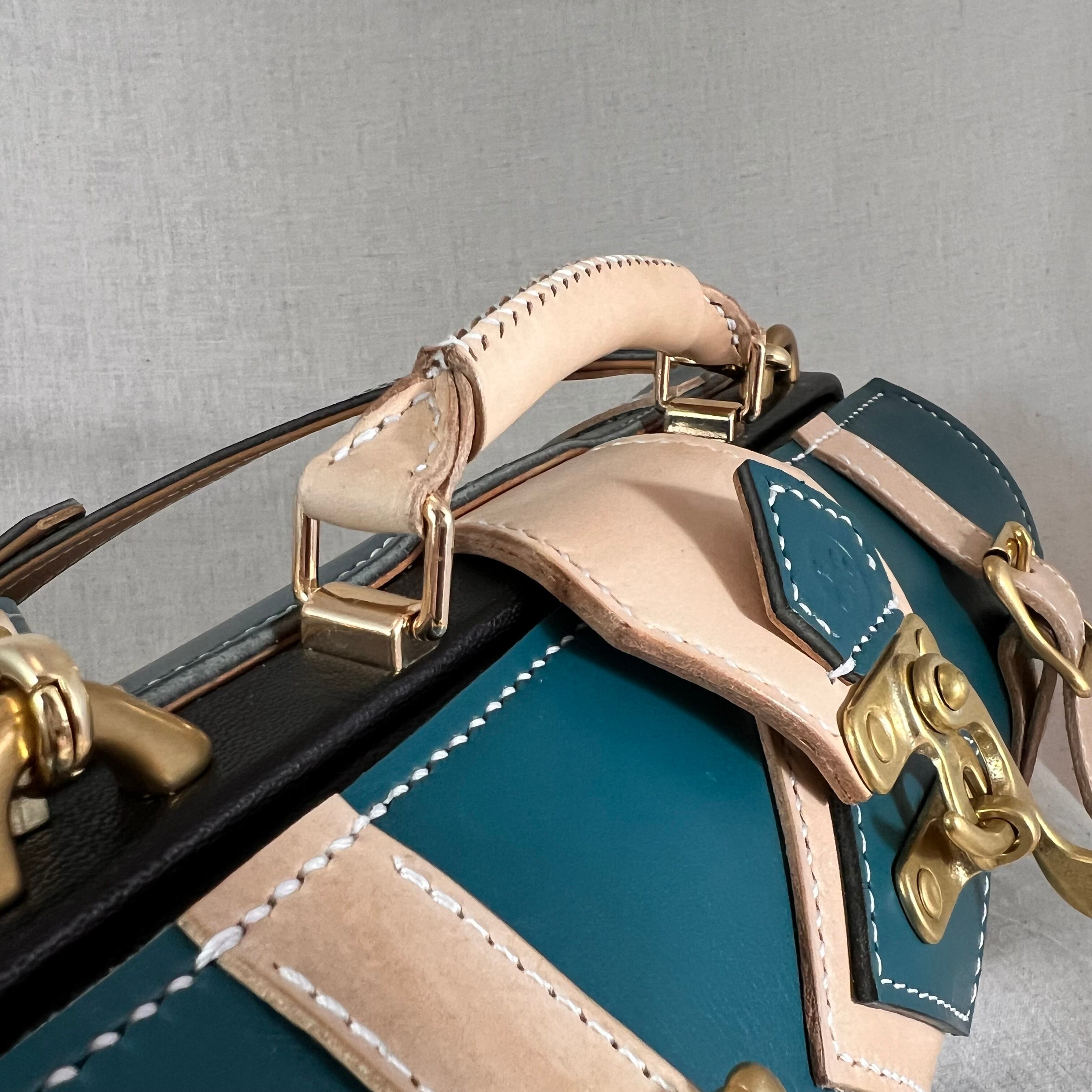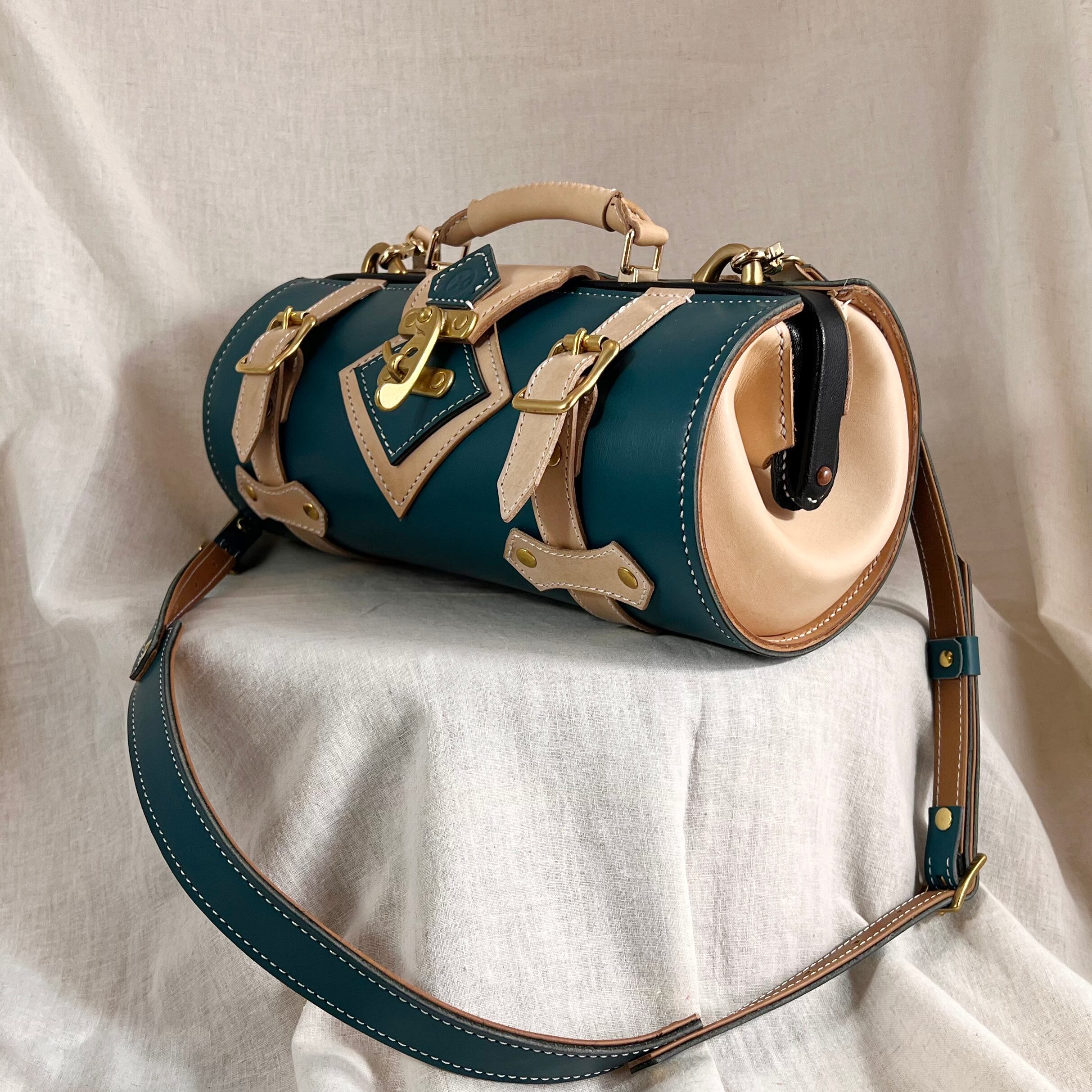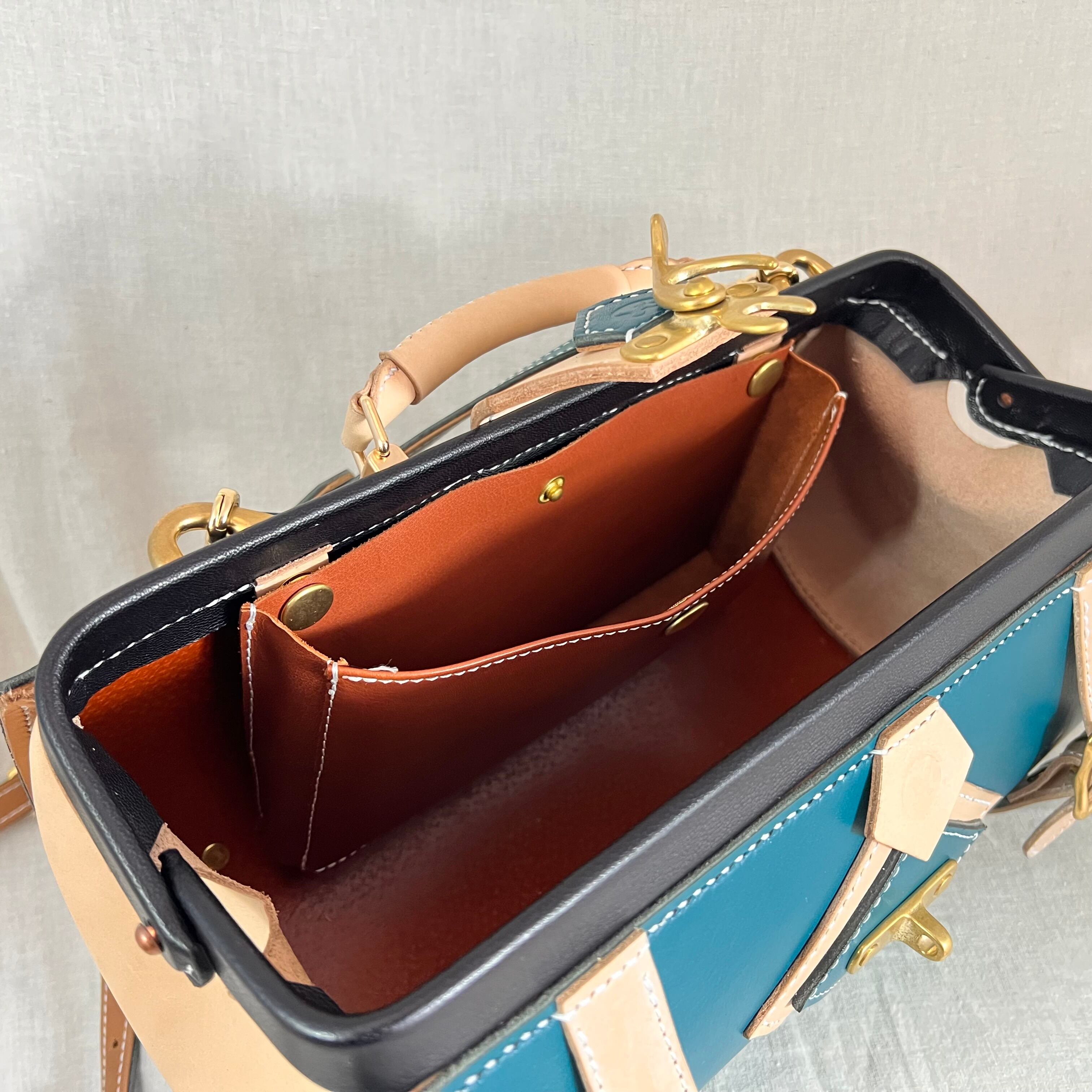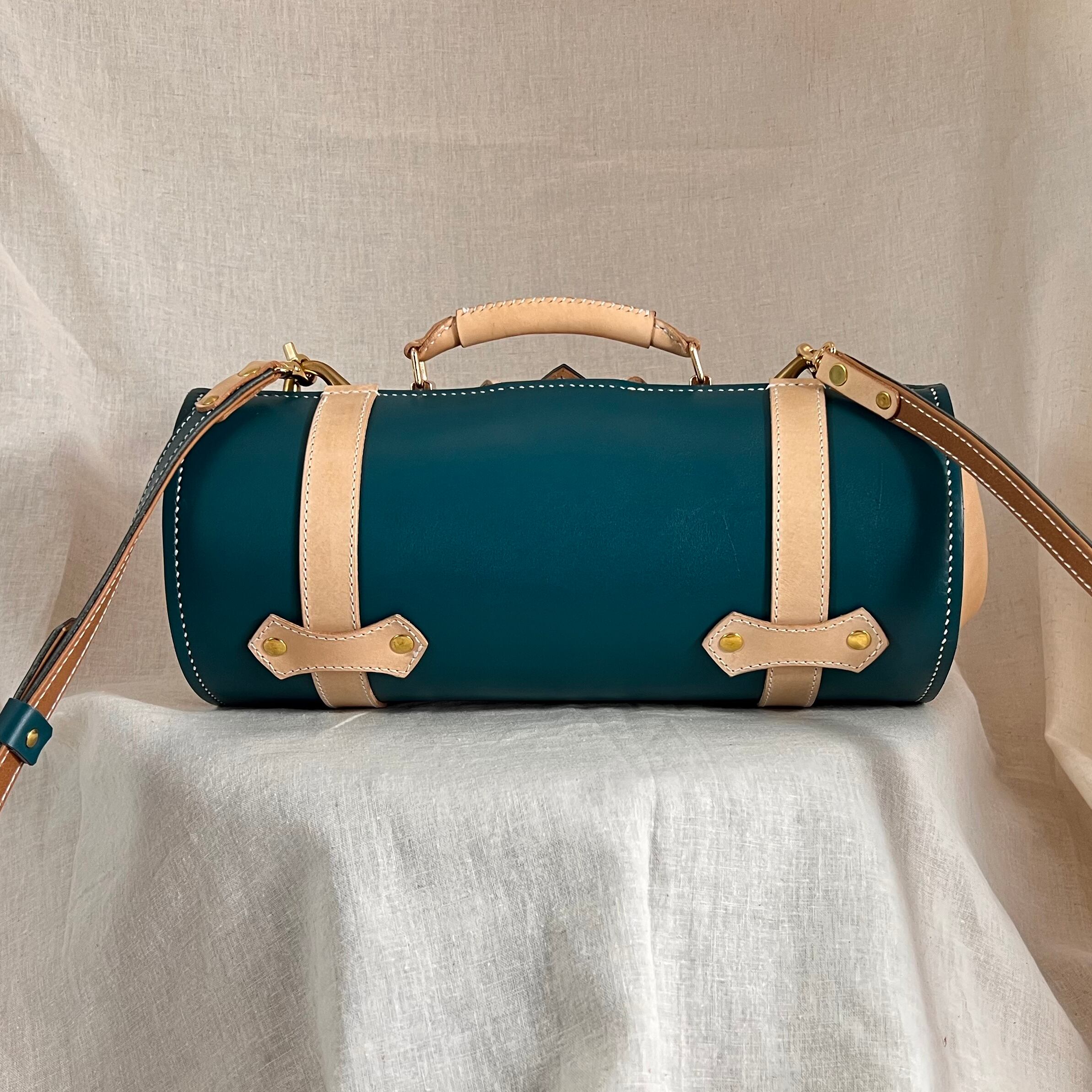 落ち着いた青緑の胴体は贅沢に一枚革で仕立てています。