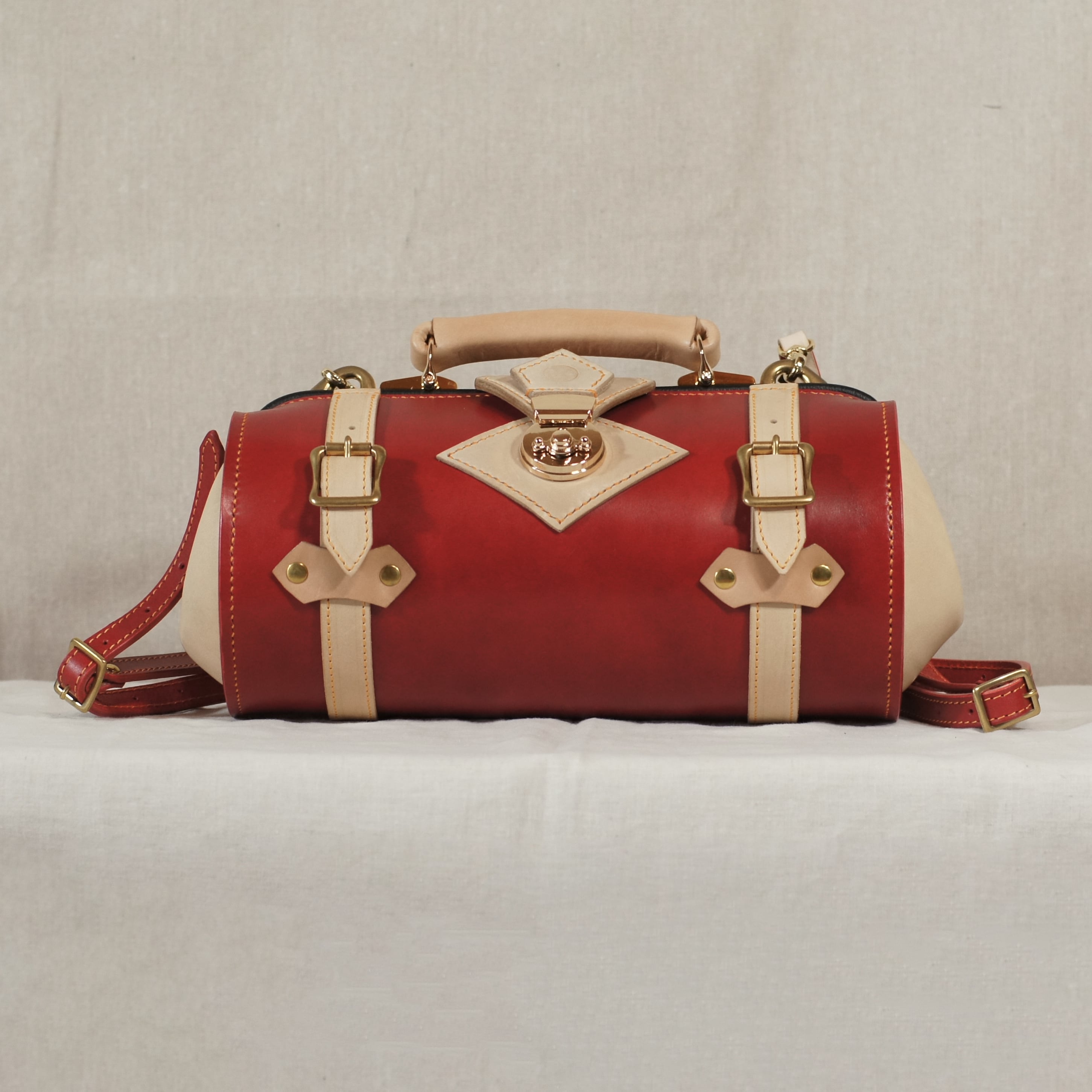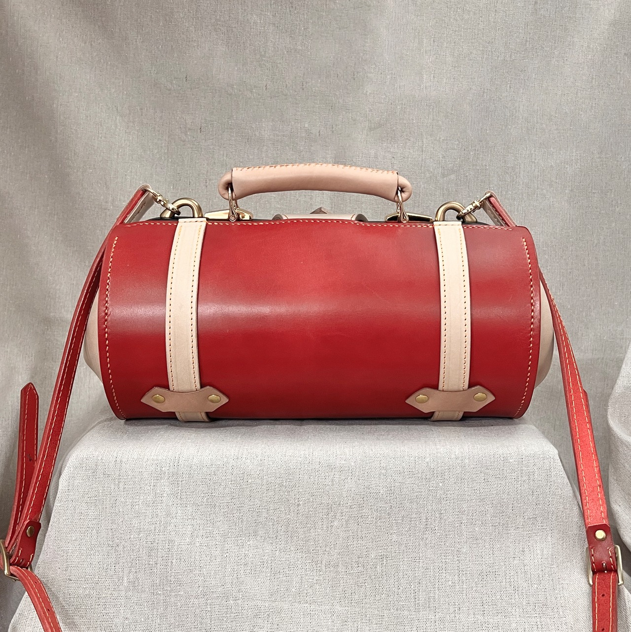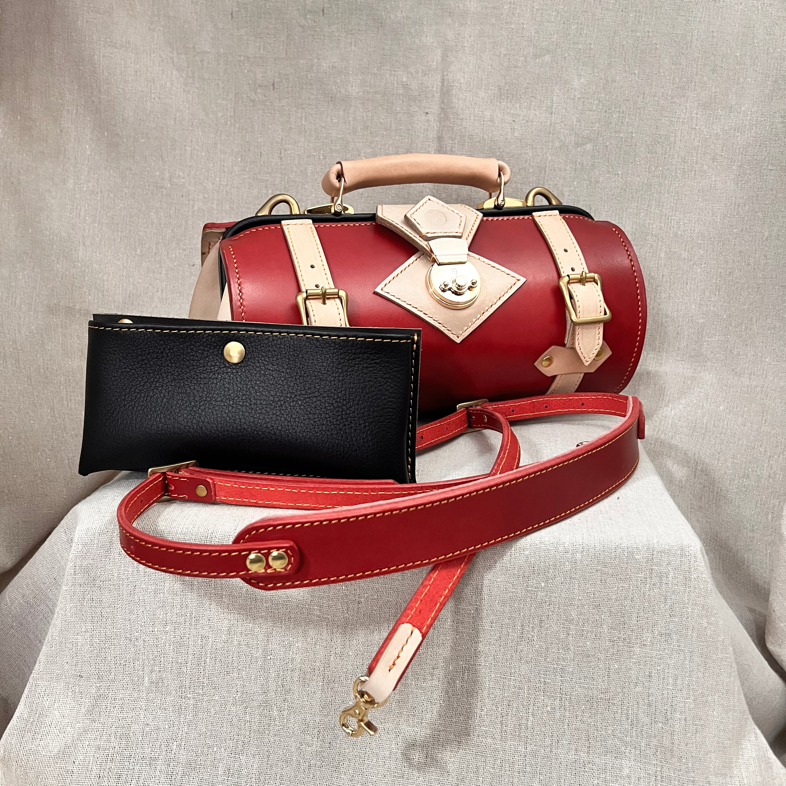 目を引く紅色とヌメ革のツートンカラーのダレスバッグ、胴体は贅沢に一枚革で仕立てています。
