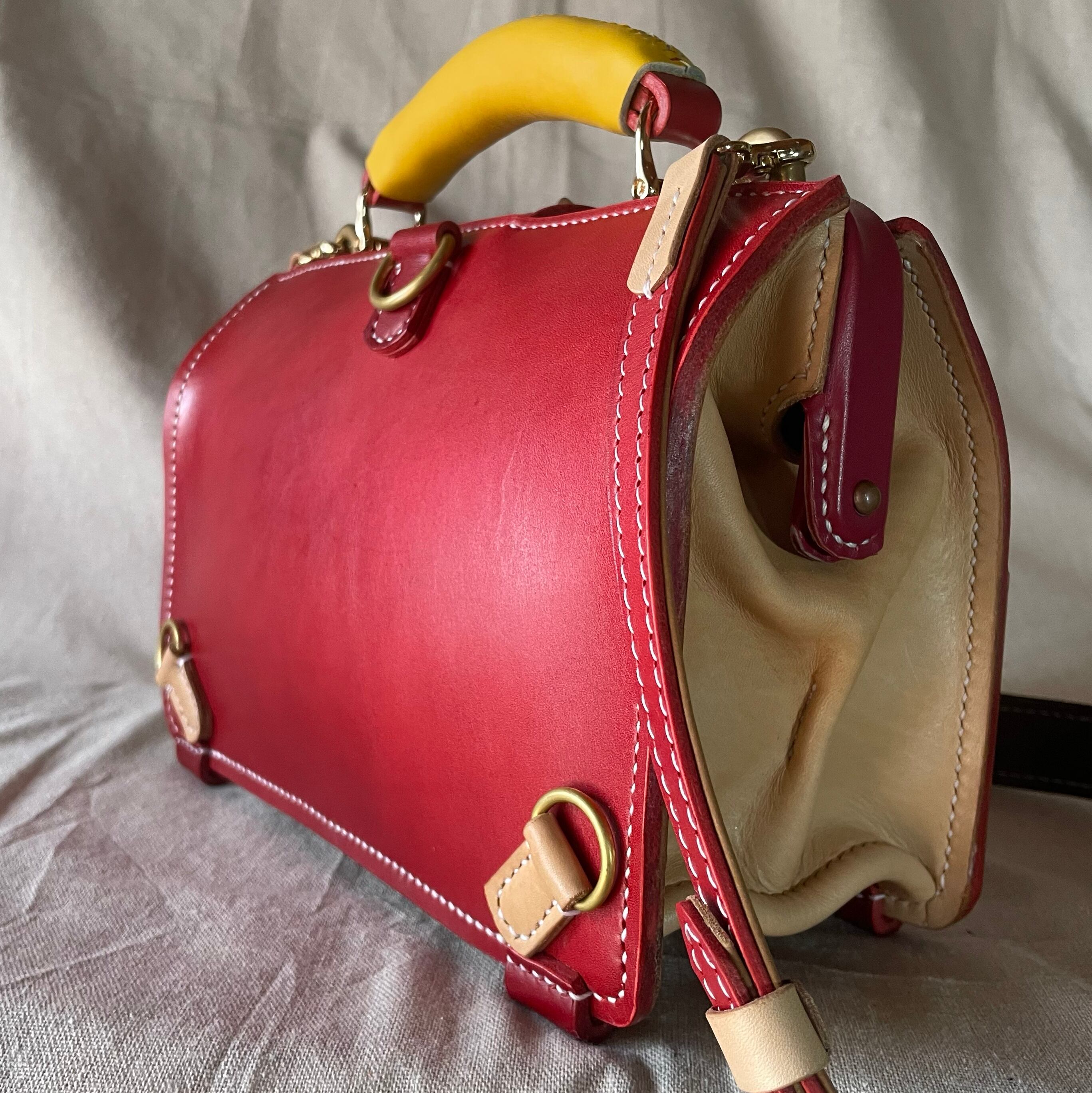極厚の赤の牛革を前胴と後胴に使用、横マチと底マチは牛ヌメ革です。