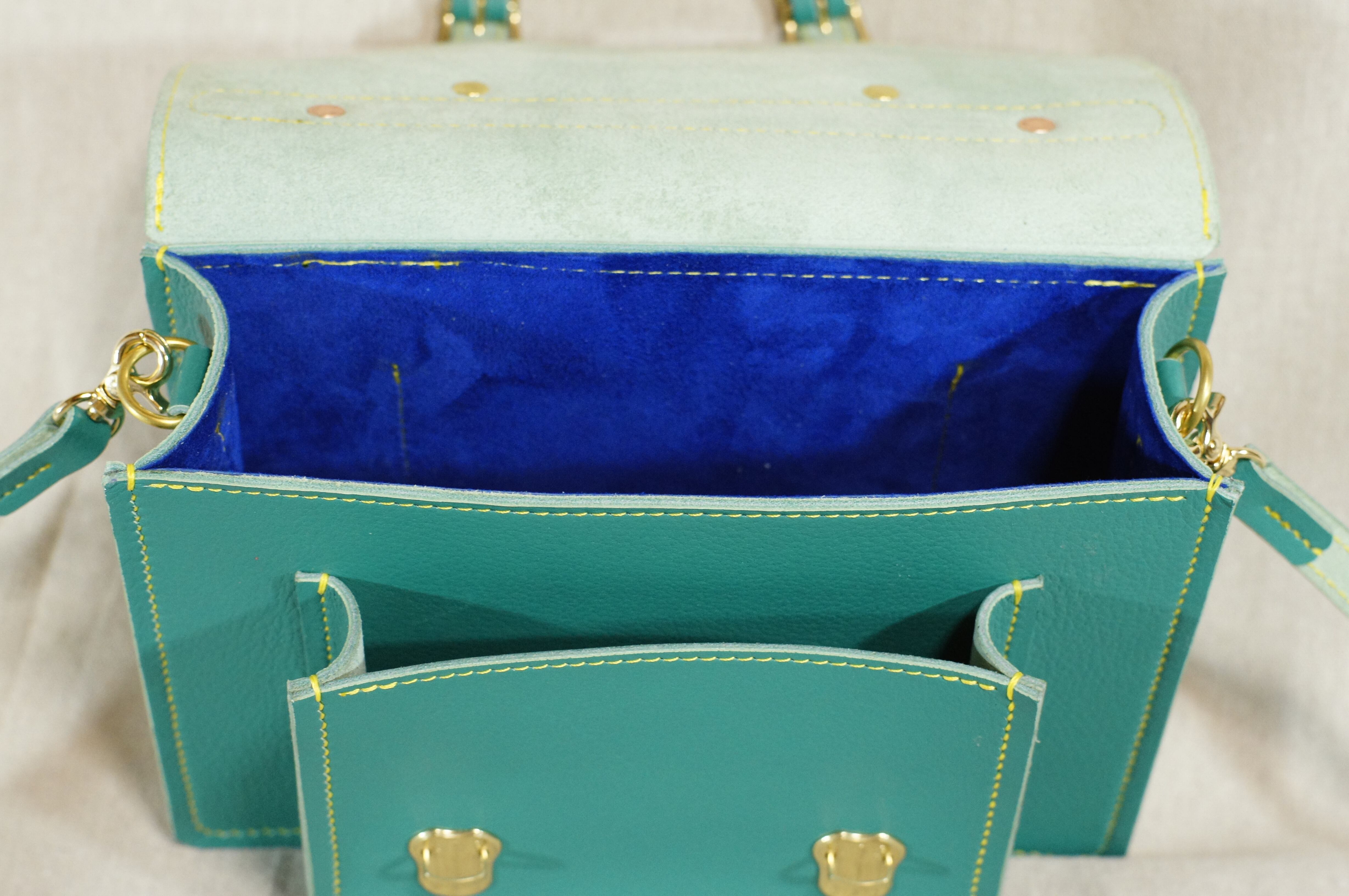 本体の内張には鮮やかなブルーのピッグスェードを貼り込んであります。