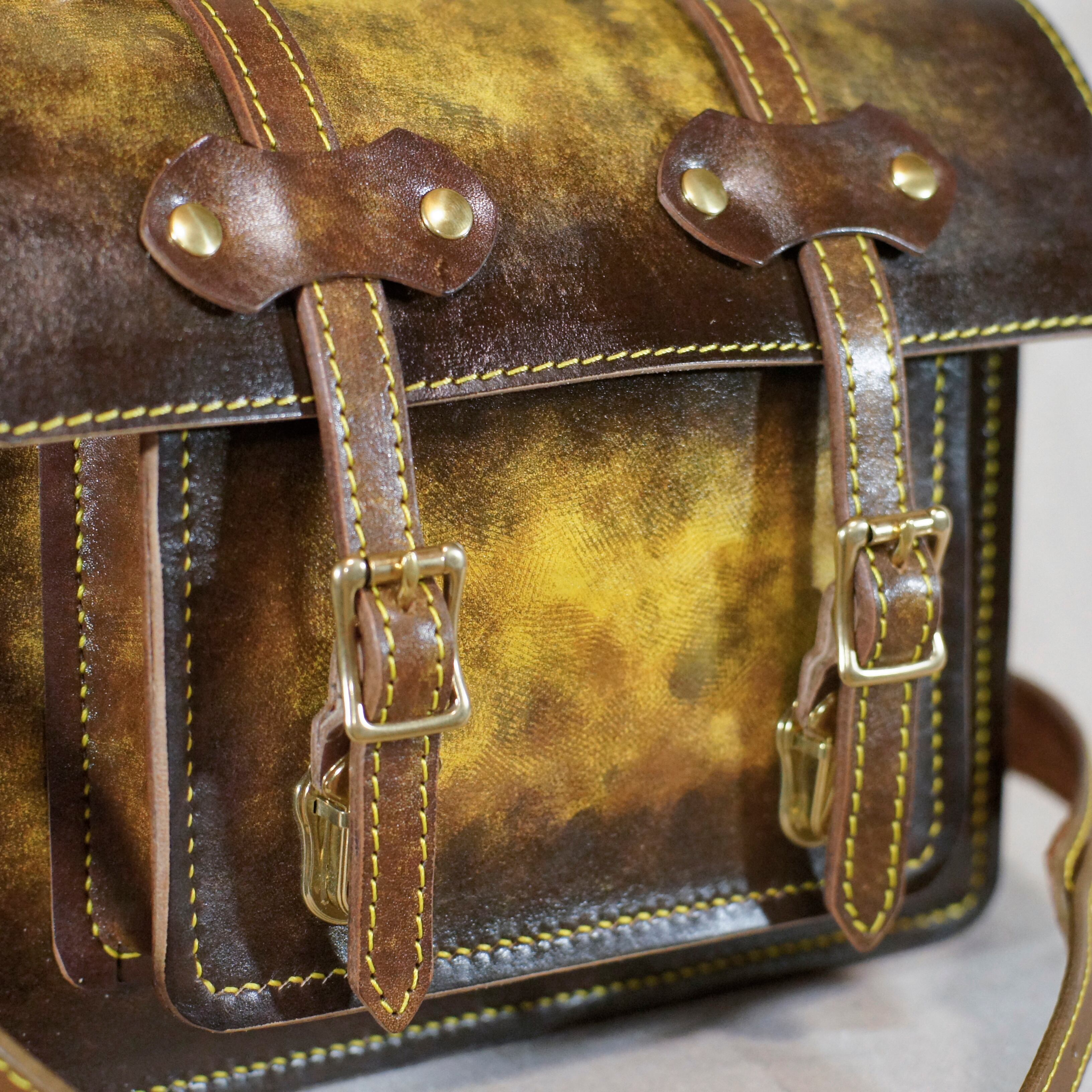 こちらのサッチェルバッグはナチュラルカラーのヌメ革をベースにぼかし染めで仕立てた本革の鞄です。