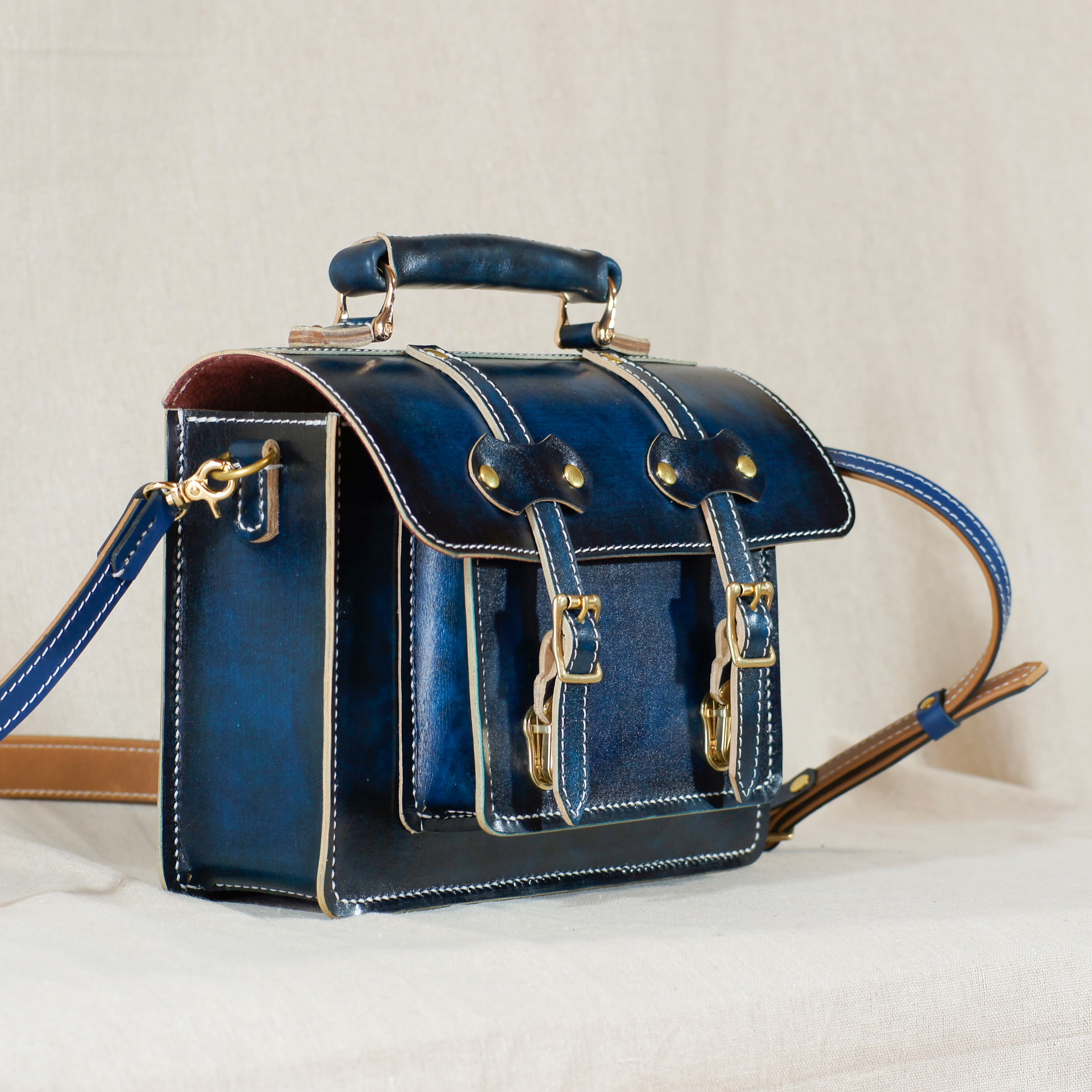 ショルダーベルトはネイビーの牛革で作っています。