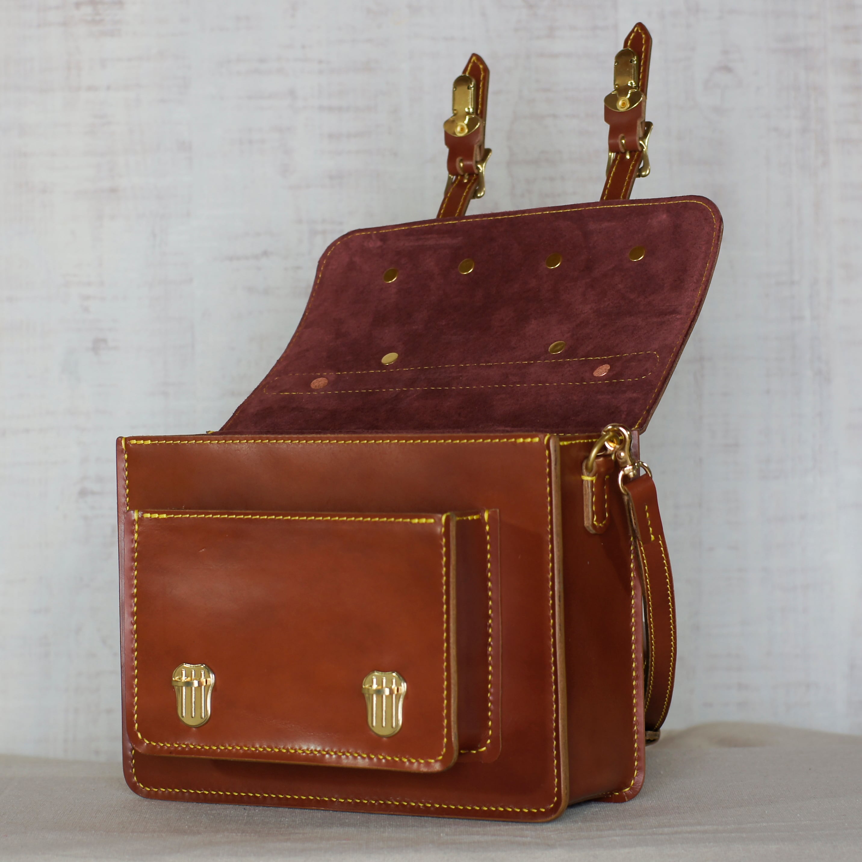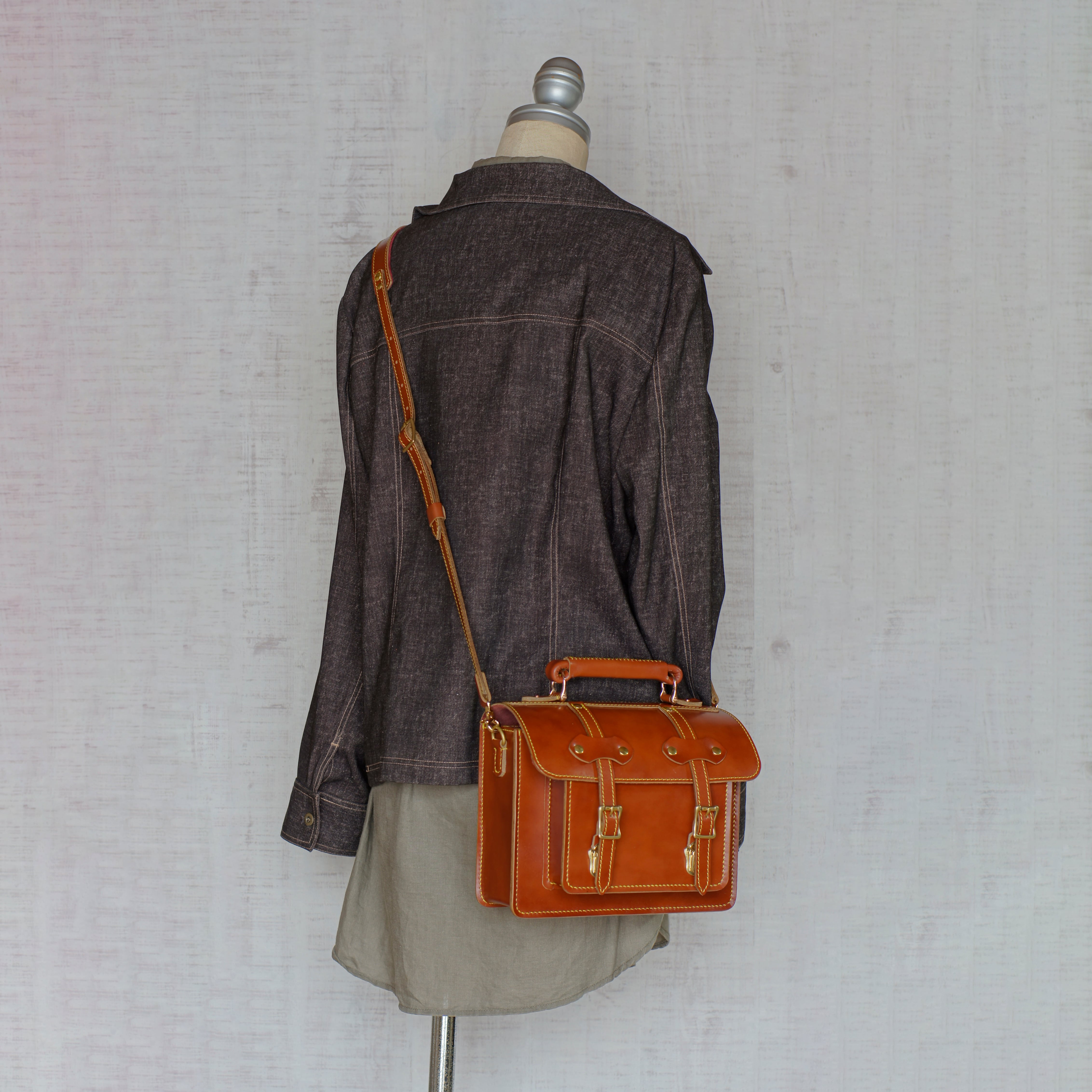 ご依頼者様のご要望で通常のサッチェルより横幅を20ミリ小さく仕立てております。