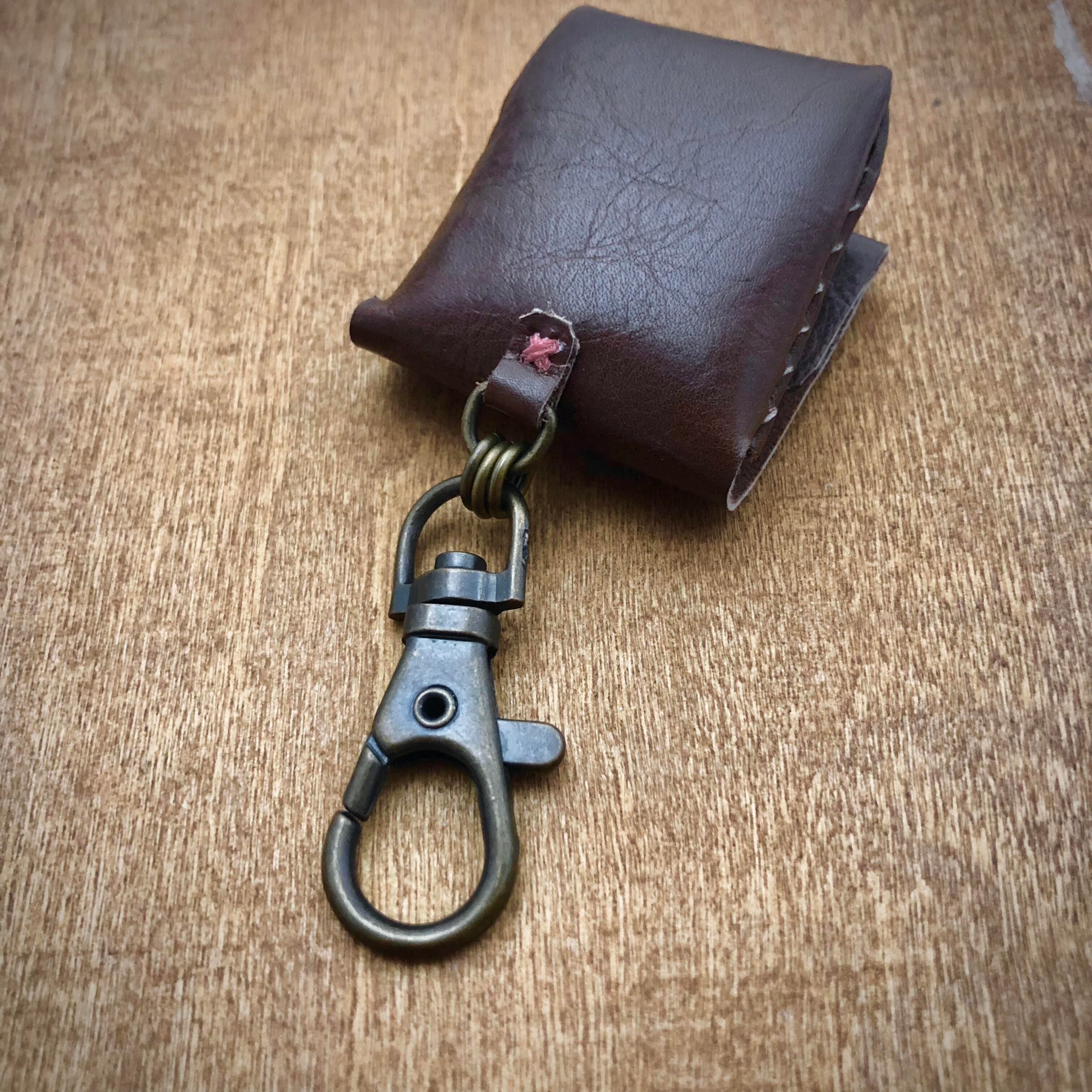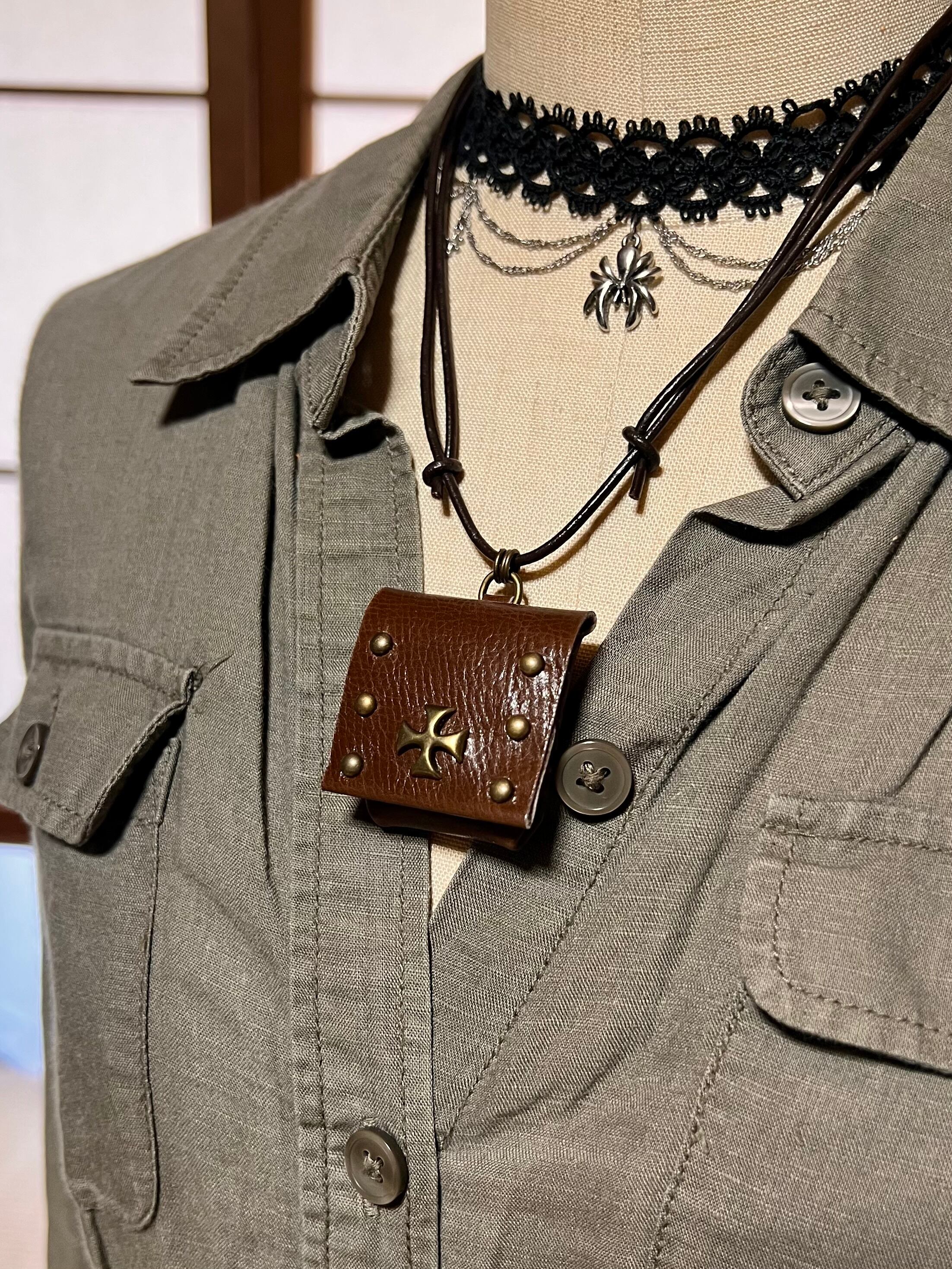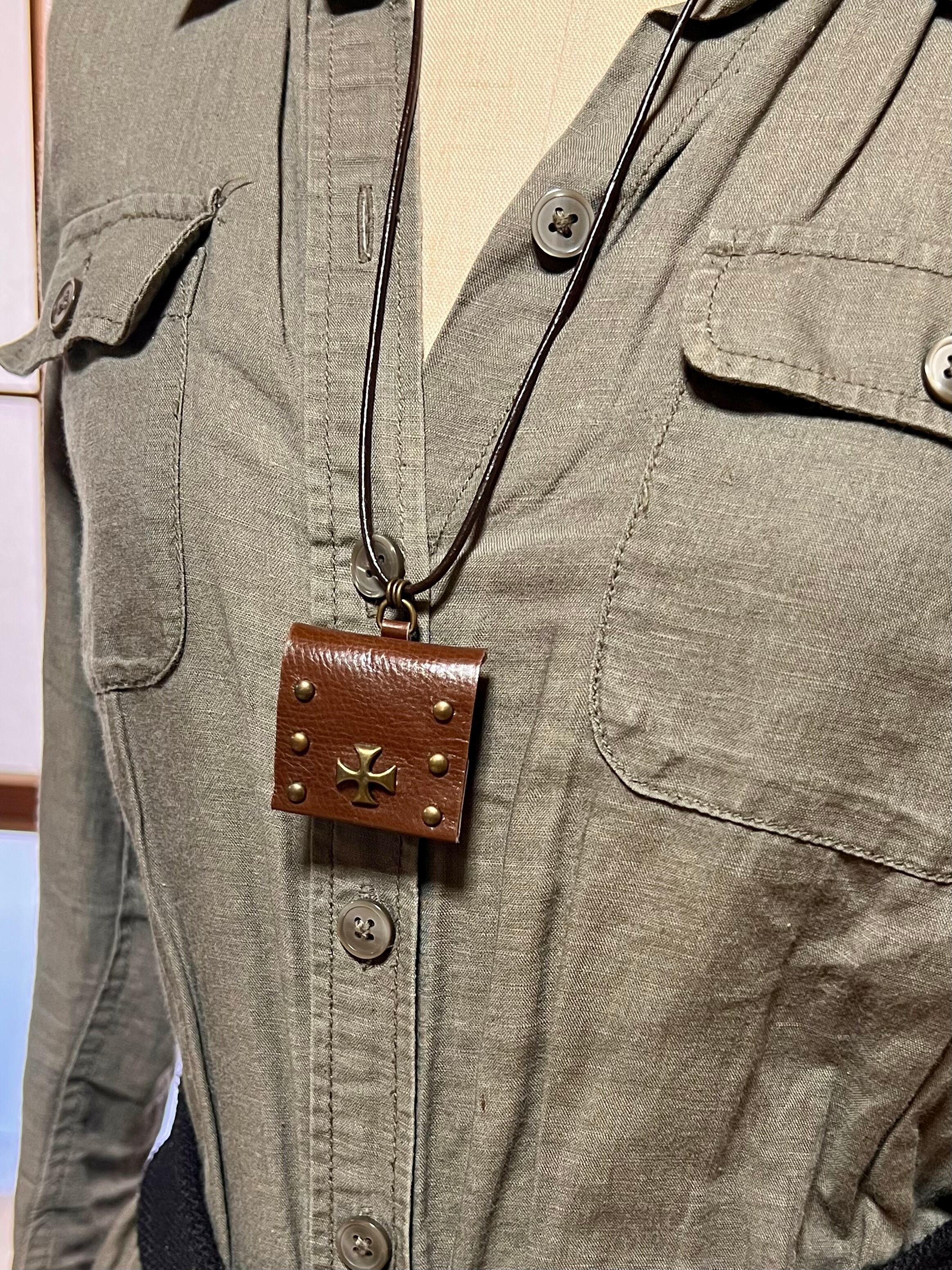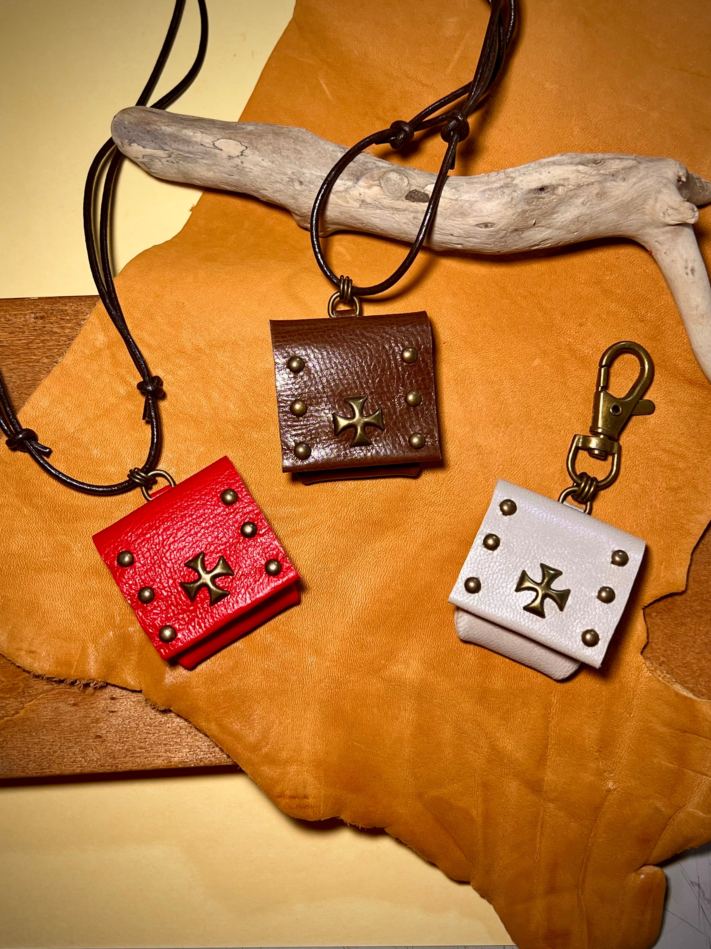 革紐のペンダントタイプ又はナスカンのキーホルダータイプ選択できます。