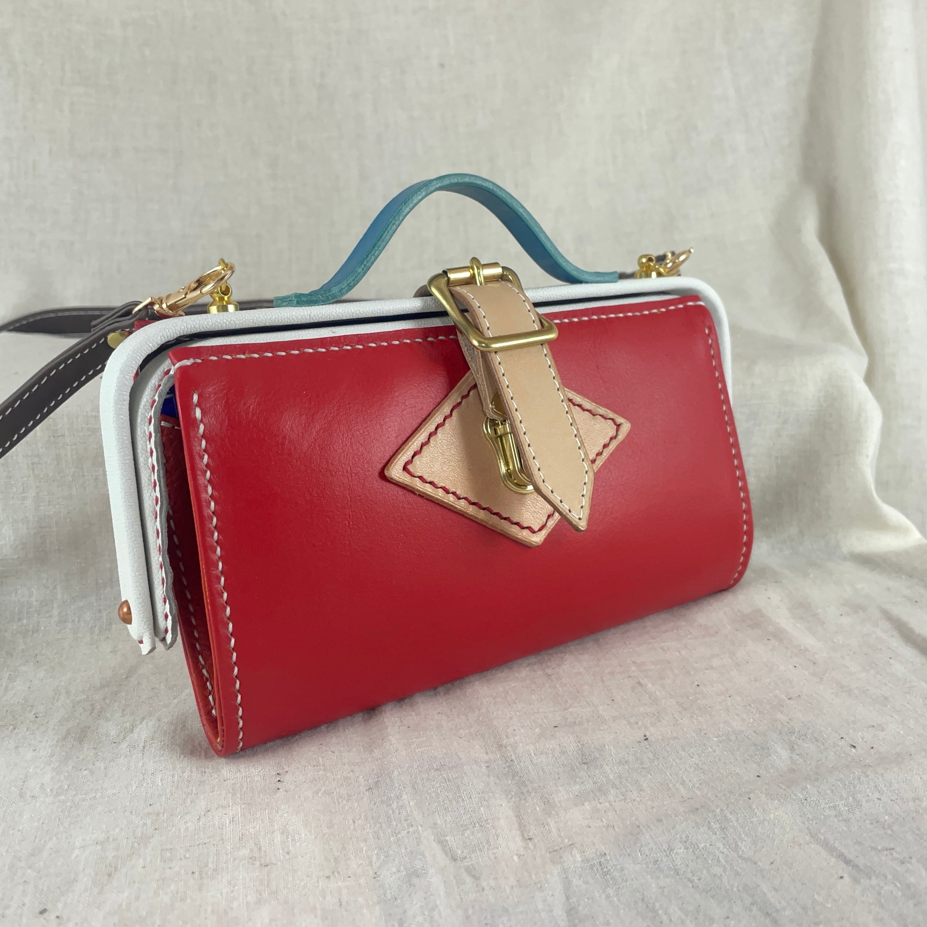 口金で開閉する長財布、ポーチの様にそのまま肩掛けできます。